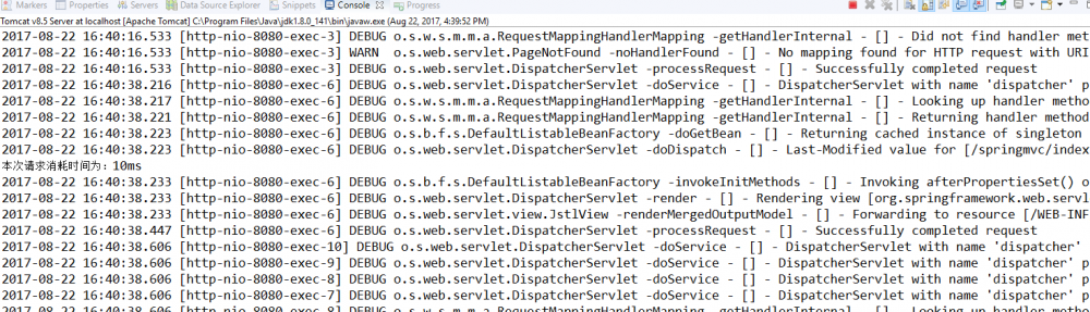 1. 引言 拦截器(Interceptor)实现对每一个请求处理前后进行相关的业务处理,类似于Servlet的Filter. 我们可以让普通的Bean实现HandlerIntercpetor接口或继承HandlerInterceptorAdapter类来实现自定义拦截器. 通过重写WebMvcConfigurerAdapter的addIntercetors方法来注册一个计算每一次请求的处理时间的拦截器. 2. 自定义拦截器的实现 2.1 定义拦截器 新建LogInterceptor类,并继承Ha
