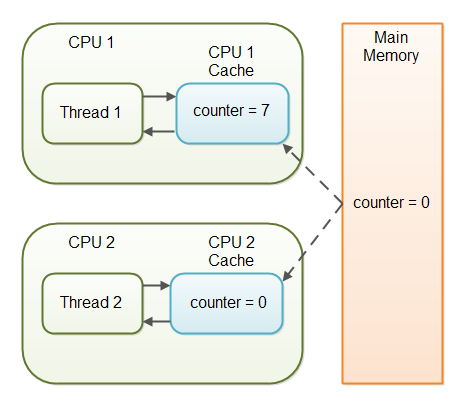 多线程环境下counter变量的更新过程。线程1先从主存拷贝副本到CPU缓存,然后CPU执行counter=7,修改完后写入CPU缓存,等待时机同步到主存。在线程1同步主存前,线程2读到counter值依然为0。此时已经发生内存一致性错误(对于相同的共享数据,多线程读到视图不一致)。因为线程2看不见线程1操作结果,也将这个问题称为 可见性问题 。