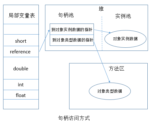 Java堆中将会划分出一块内存来作为句柄池,reference中存储的就是对象句柄位置,而句柄中包含了对象实例数据与类型数据各自的具体地址信息。