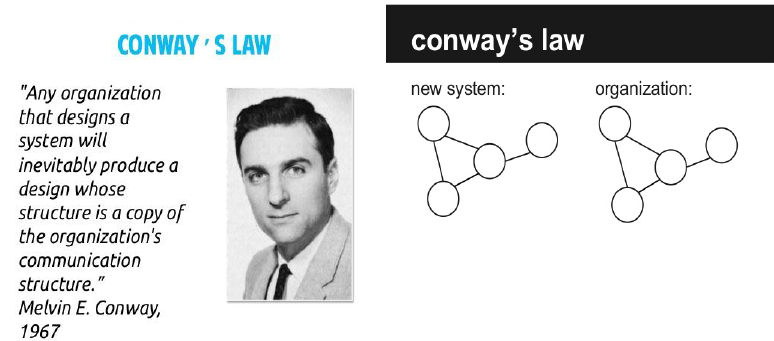 Conway’s law: Organizations which design systems[...] are constrained to produce designs which are copies of the communication structures of these organizations.