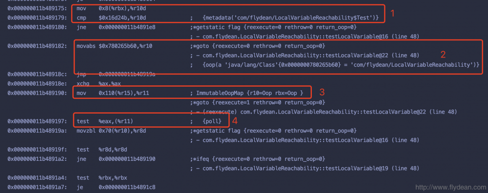 红框3表示的是进入while循环的时候,ImutableOopMap中存储的对象,大家可以看到里面只有r10和rbx,也就是说只有类实例和其中的一个Test实例。