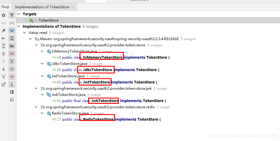 IDEA中,Ctrl+Alt+B,可以看到TokenStore的实现,有如下几种: