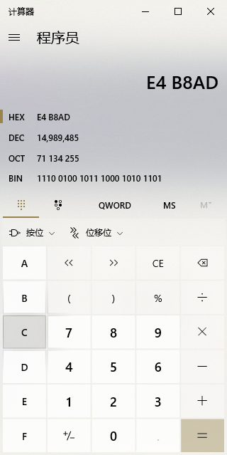 十六进制: E4 B8 AD 二进制: 1110 0100 1011 1000 1010 1101 去掉补码: 1110 0011 1011 0111 1010 1100 反码: 0001 1100 0100 1000 0101 0011 十进制: 28 72 83