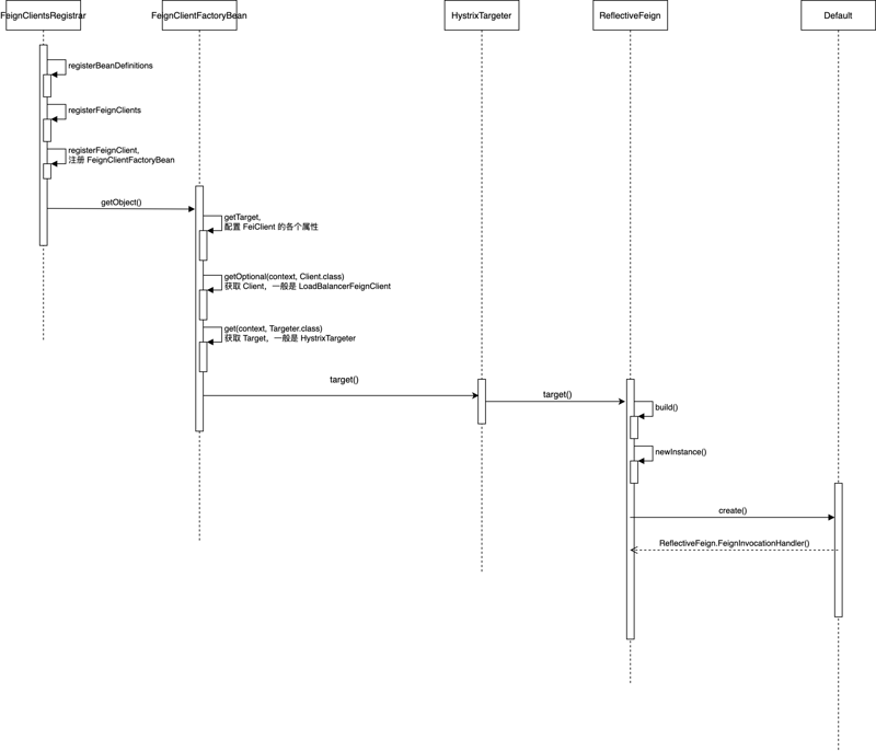 为每个 @FeignClient 注入的 Feign 配置类 FeignClientFactoryBean,实现了 FactoryBean。在 getObject()时,创建 ReflectiveFeign.FeignInvocationHandler。 FeignInvocationHandler 对应的就是被 @FeignClient 注解标注的类。方法则对应 SynchronousMethodHandler。 当在调用时 Feign 方法时,会被 FeignInvocationHandler 代理。