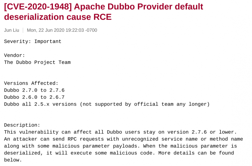 所有 Dubbo 版本都可以升级到 2.7.7 或更高版本,避免该漏洞: https://github.com/apache/dubbo/releases/tag/dubbo-2.7.7