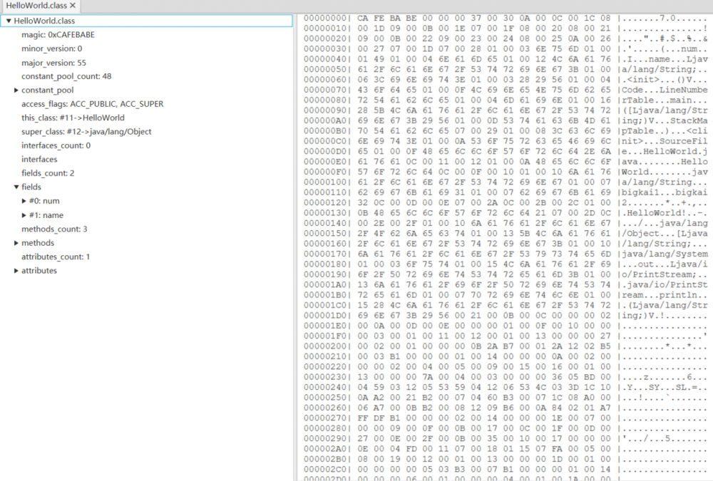 我们便可以看到在java文件下生成了一个 HelloWorld.class 文件,使用类文件解析器 classpy 打开该文件,可以看到文件的整体结构: