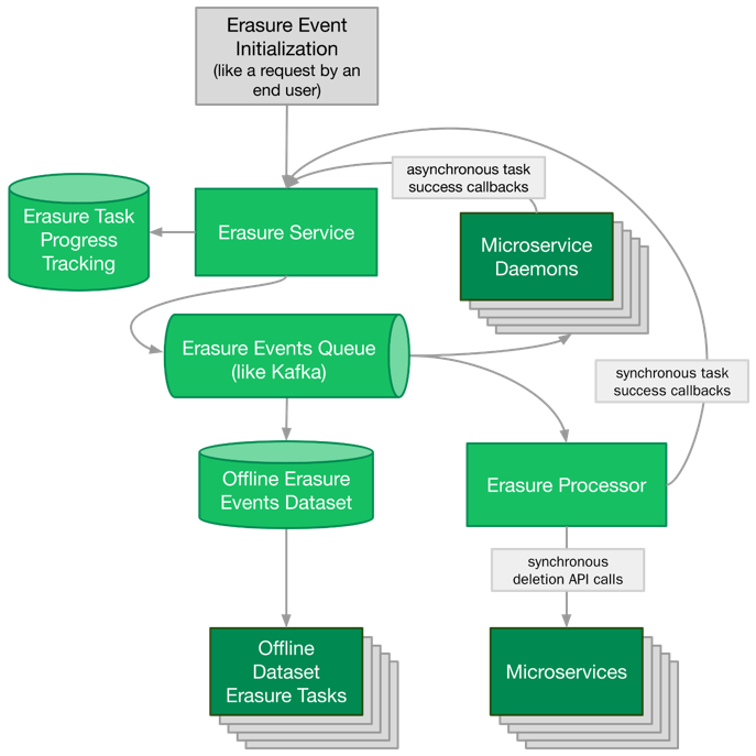 但这一方法的缺点是:它假设每个数据擦除任务都可以在一个API调用周期的时间内完成,通常是几毫秒、几秒,或者再稍长一点的时间。但如果数据擦除不能在一个周期内完成,擦除管道将变得复杂一些。不能在一个API调用周期内完成删除的数据包括导出到离线快照的数据,或存在于多个后端和缓存中的数据等。这种非规范化的数据是微服务架构为提高性能,所固有的数据形态。这也意味着数据生命周期管理的责任被委托给了拥有数据API和业务逻辑的团队。