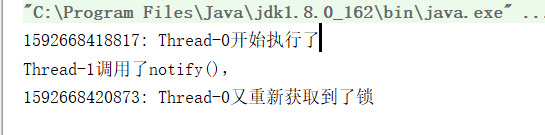从结果可以看出来,线程0的执行顺序是先wait,再被notify后,重新获得锁再继续执行完成的,并且线程1的释放锁不是在notify后就立即释放而是该线程执行完毕后释放。