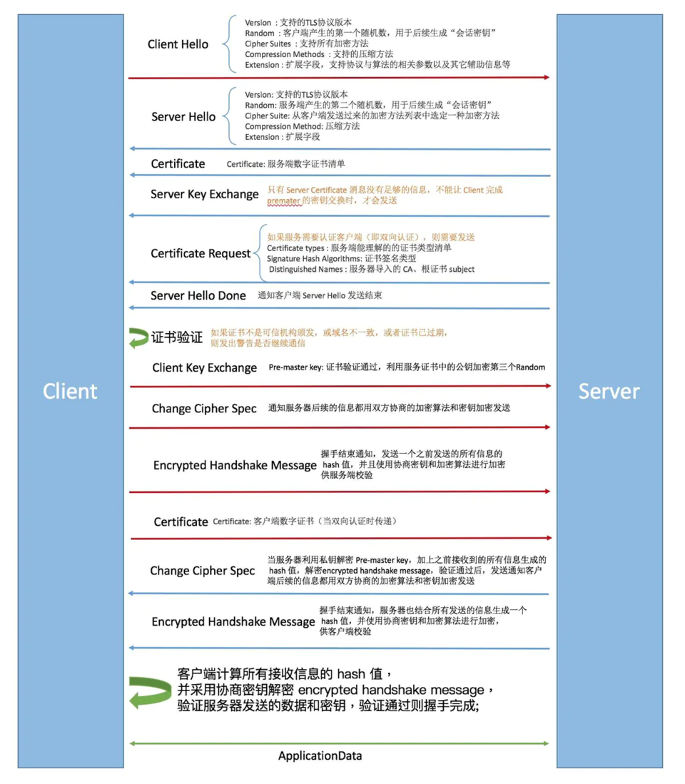 Http2.0的前置条件是实现了https。而Https则是在Http的基础上增加了一层Tls。这个东西在大厂的面试中其实是一个高频考点了,简单的说Tls就是一个前后端约定好后续加密方式的过程。这篇文章写的很好,详细可以参考这个 传送门 ,而整体流程如下图。