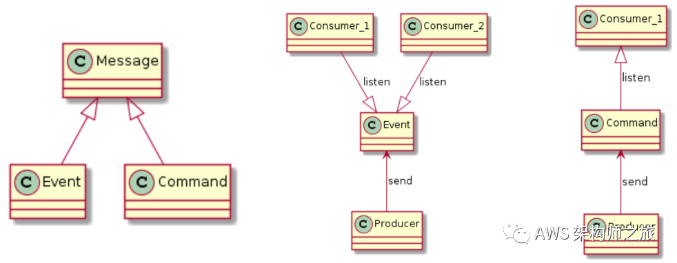 事件驱动的场景里面,我们会不断听到 “消息”、”事件“和”命令“ ,因此,我们首先要达成一致的理解,如何区别这三者?一个比较好的实践是通过 ”意图“ 来区分,如上图所示,所谓 ”消息“ 是”事件“和”命令“的泛化,没有特别明确的意图; “命令” 就非常具体,通常是发生在生产者(发出命令的一方)和消费者(接受和执行命令的一方)1对1的通信,表示生产者期望消费者有所行动,命令必须能够被消费者接受到;而 “事件” 消息,一个生产者产生的事件,可以被多个消费者接受,生产者不关注消费者是否或如何响应事件,事件必须被生产者发布。