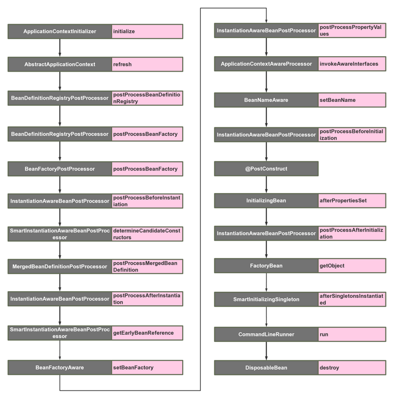 所以在这篇文章里,我总结了几乎Spring & Springboot所有的扩展接口,以及各个扩展点的使用场景。并且整理出了一个bean在spring内部从被加载到最后初始化完成所有可扩展点的顺序调用图。从而我们也能窥探到bean是如何一步步加载到spring容器中的。