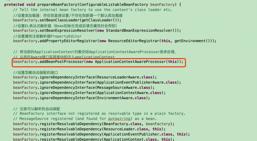 那么还有哪些常见的Aware呢?我自己最常用的一个就是ApplicationContextAware,这个接口的代码我就不贴出来了,因为和上面是一样的,就一个set方法而已,那么又是在哪个地方给我们的bean执行了setApplicationContext的方法呢?我们之前文章中介绍AbstractApplicationContext的refresh方法的时候,其中有个prepareBeanFactory方法,这个方法中有这么一句代码: