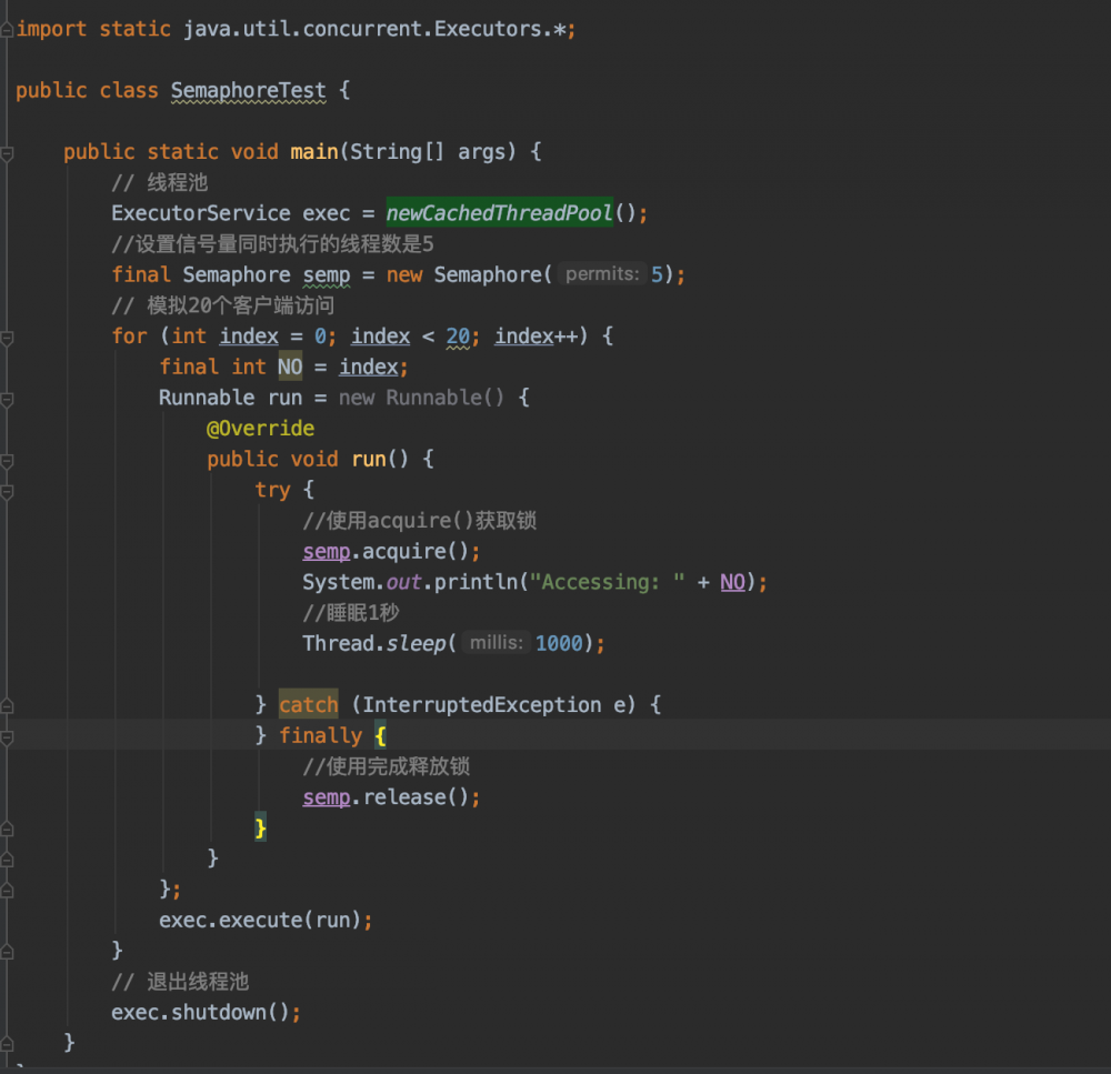 然后并发执行10个线程,在线程中利用Semaphore控制线程的并发执行,