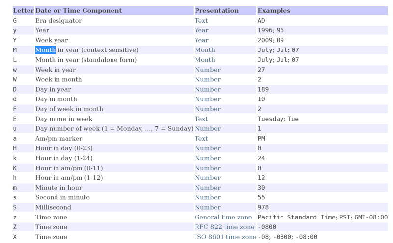 下面这张图表示了日期的模式,其中大写的M表示一年中的第几月,小写的m表示时分秒的分;大写的D是一年当中的第几天,小写的d是一个月中的第几天;大写的H表示Hour in day (0-23),小写的h Hour in am/pm (1-12);大写的S表示毫秒,小写的s表示秒,每个具体的含义可以参考下图: