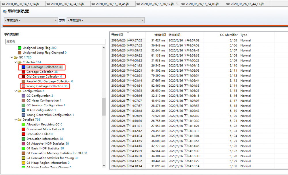 首先我们来看 GC,我们的 GC 算法是 G1,主要通过 G1 Garbage Collection这个事件查看: