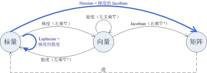 图中的细实线箭头表示了四种一阶微分运算,包括梯度、散度、旋度和 Jacobian。每条箭头的起点表示了相应运算的自变量的类型,终点表示了相应运算的因变量的类型,例如梯度运算是作用在标量上的,结果是向量。图中的「向量」默认为列向量。