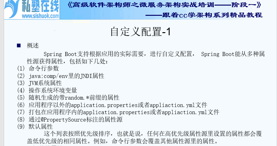 Spring Boot支持根据应用的实际需要,进行自定义配置, Spring Boot能从多种属性源获得属性,包括如下几处: