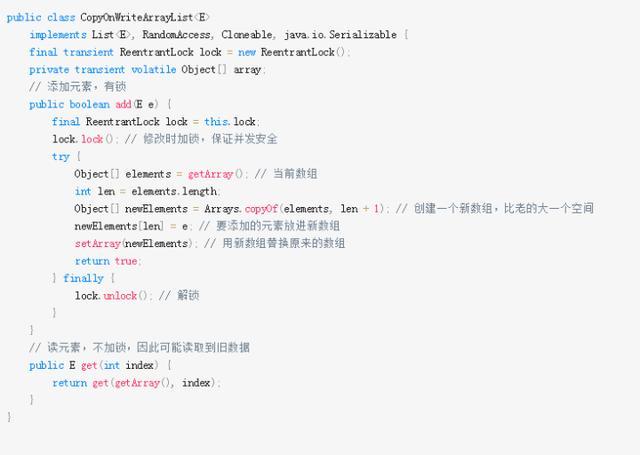 并发版ArrayList,底层结构也是数组,和ArrayList不同之处在于:当新增和删除元素时会创建一个新的数组,在新的数组中增加或者排除指定对象,最后用新增数组替换原来的数组。