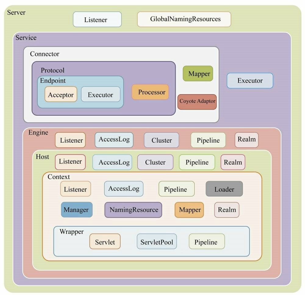 Tomcat内部有4个级别的容器,分别是Engine、Host、Context和Wrapper。Engine代表全局Servlet引擎, 每个Service组件只能包含一个Engine容器组件,但Engine组件可以包含若干Host容器组件。 除了Host之外,它还包含如下组件。