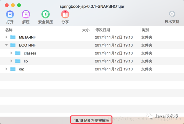 整个Jar包 18.18 MB, 但是 BOOT-INF/lib 就占用了将近 18 MB: