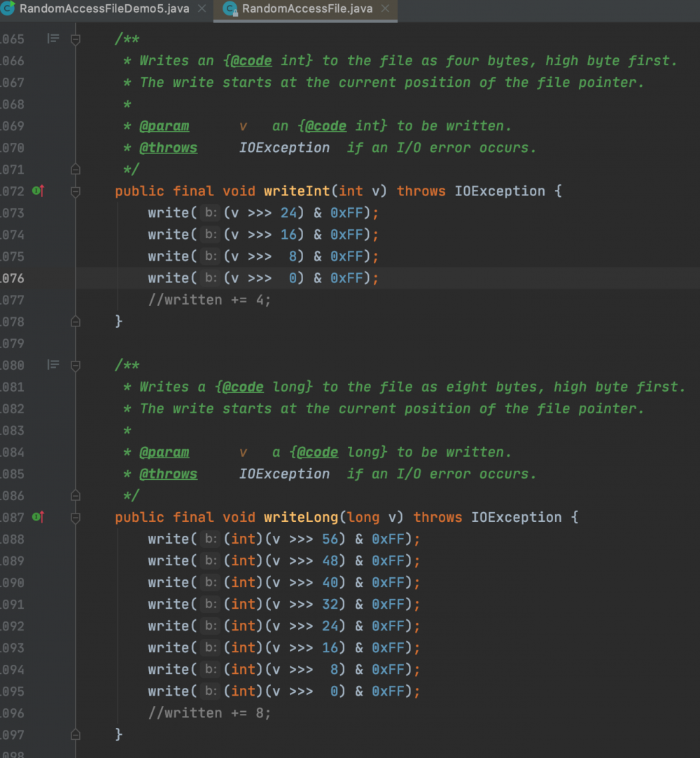 从上面的代码中我们可以通过位移的方式按顺序每次写入一个int值的八位,写四次正好是一个int值的四个字节,当然我们我们也可以用提供好的 writeInt() 方法来直接写入,其底层代码远离其实也是用到了位移的思想,如下源码:
