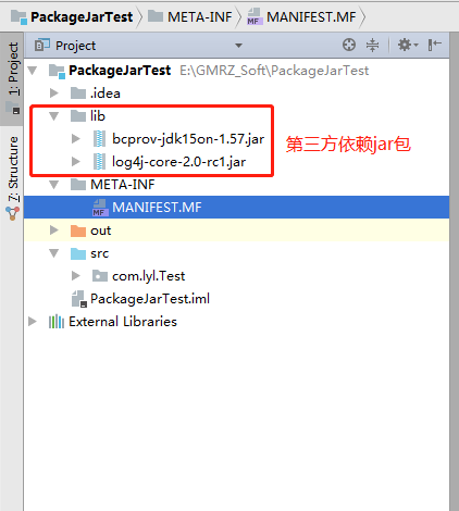 可以将打好的jar包 “ packagetest-1.0.0.jar ”, 与 签名包 bcprov-jdk15on-1.54.jar 放到引用的项目的 lib 文件夹下(需要保证这两个jar包在项目中的存放的位置在同一级别 即可); 然后在使用时就会使用 外部引用的 依赖签名包中的类了,不会报 类找不到 。
