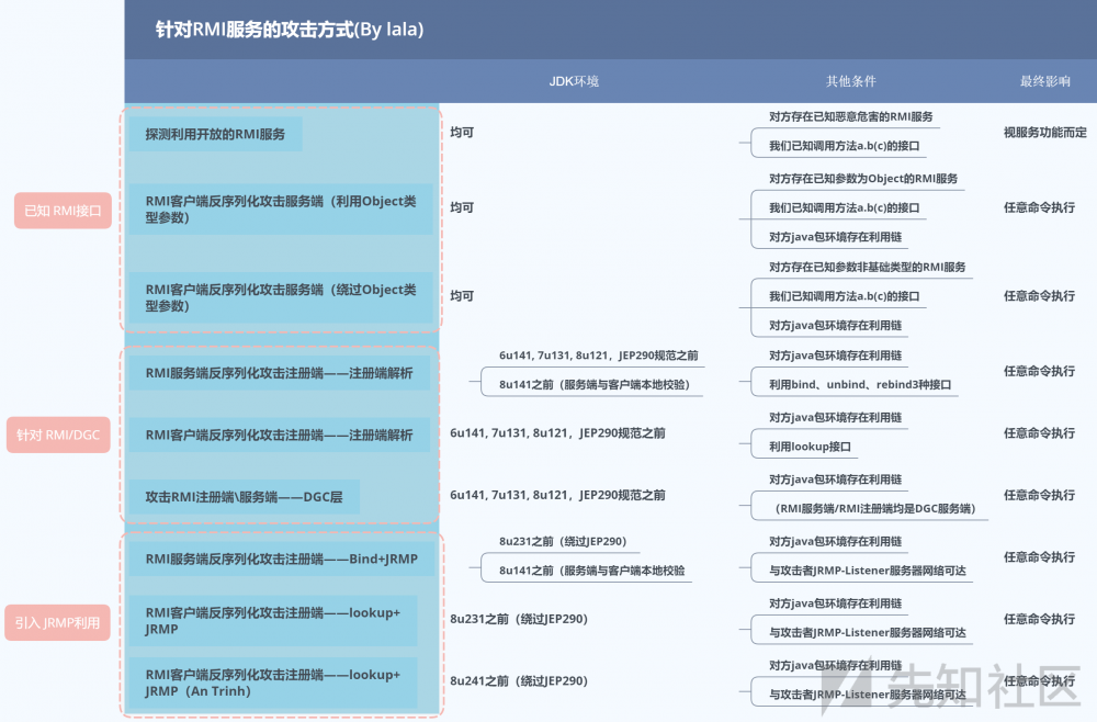 于是.....花了按照月为单位的很长时间洋洋洒洒写了3w字的文整理了针对RMI服务的9种攻击方式,长文少有人能看下去,先丢上最终的研究的结果吧。(其实我感觉是不是应该去混议题的,算了资历尚浅,下次一定。死人脸)