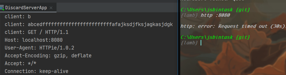 上面这段代码将客户端发送信息打印出来,并没有回应任何消息,所以叫 DiscardServer ,因为我们使用http客户端发送,所以出现了超时现象,我们对比上一节将Netty 中使用的原生组件一一找出;首先是我们一眼就能看到的: