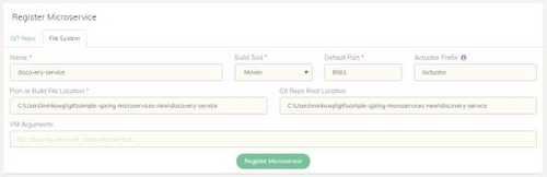 由于我已经将微服务应用源代码克隆到本地工作目录,因此我将选用以上方式的第三种。在注册微服务表单中,必须要填写微服务名称、端口、actuator 接口路径,以及默认构建工具和 Maven pom.xml 文件路径。