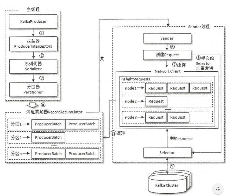 RecordAccumulator内以分区为单位,为每个分区维护一个双端队列,消息进来的时候,从尾端插入队列,Sender线程从队列头取出消息并发送。