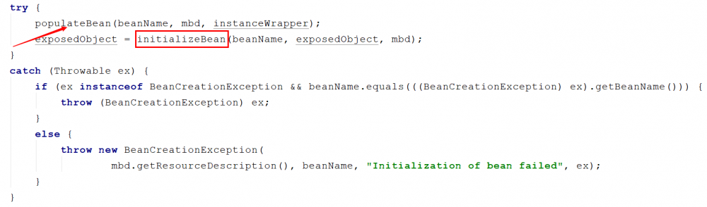protected Object doCreateBean(String beanName, RootBeanDefinition mbd, @Nullable Object[] args) throws BeanCreationException { // 1.实例化 ---> createBeanInstance // 2.属性注入 ---> populateBean // 3.初始化 ---> 完成初始化及AOP // exposedObject 就是完成初始化后的Bean // 省略部分代码,省略代码的作用已经在上面标明了 // 下面的代码实际上主要目的在于处理循环依赖 if (earlySingletonExposure) { Object earlySingletonReference = getSingleton(beanName, false); if (earlySingletonReference != null) { if (exposedObject == bean) { exposedObject = earlySingletonReference; } // 我们之前早期暴露出去的Bean跟现在最后要放到容器中的Bean不是同一个 // allowRawInjectionDespiteWrapping为false // 并且当前Bean被当成依赖注入到了别的Bean中 else if (!this.allowRawInjectionDespiteWrapping && hasDependentBean(beanName)) { // 获取到当前Bean所从属的Bean String[] dependentBeans = getDependentBeans(beanName); // 要得到真实的从属的Bean Set<String> actualDependentBeans = new LinkedHashSet<>(dependentBeans.length); for (String dependentBean : dependentBeans) { // 移除那些仅仅为了类型检查而创建出来 if (!removeSingletonIfCreatedForTypeCheckOnly(dependentBean)) { actualDependentBeans.add(dependentBean); } } if (!actualDependentBeans.isEmpty()) { // 抛出异常 // 出现了循环依赖,并且实际存在容器中的Bean跟被当作依赖注入到别的Bean中的 // 不是同一个对象,这个时候也报错 } } } } // 注册bean的销毁回调 try { registerDisposableBeanIfNecessary(beanName, bean, mbd); } catch (BeanDefinitionValidationException ex) { throw new BeanCreationException( mbd.getResourceDescription(), beanName, "Invalid destruction signature", ex); } return exposedObject;}