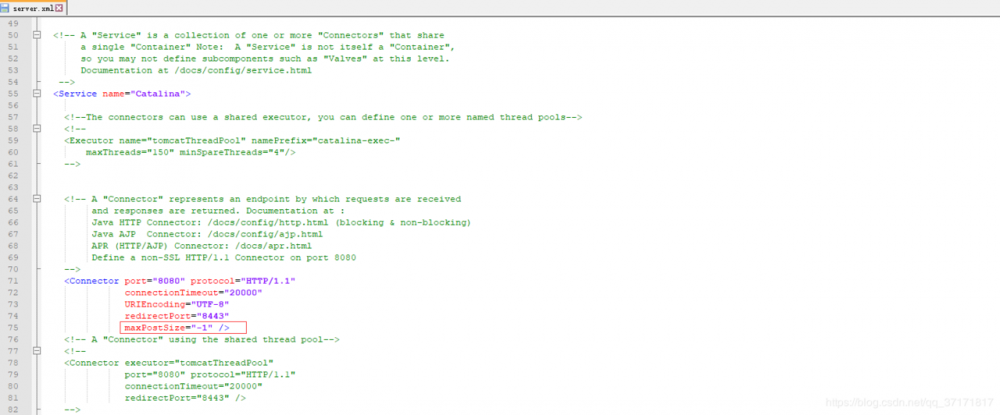 找到tomcat目录下的/conf/server.xml,为其添加maxPostSize参数