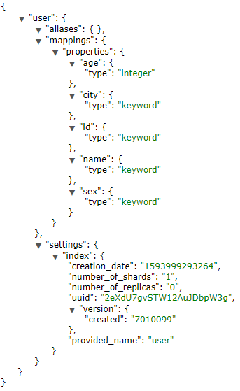 通过调用该方法,就可以创建一个索引 user ,索引信息如下: