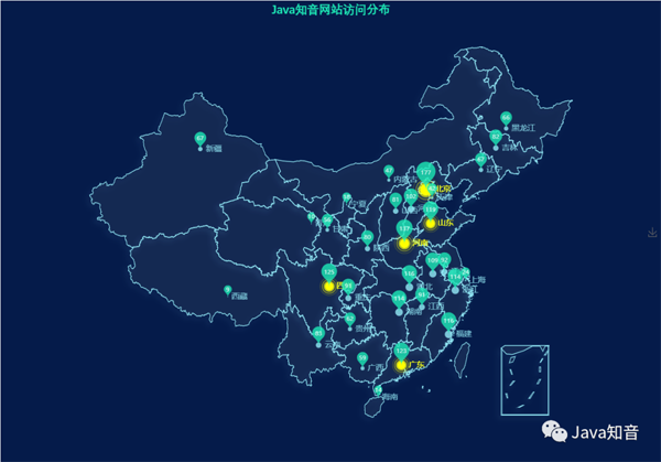 自定义拦截器,对用户的登录请求进行拦截,在此处判断请求ip所在城市,并进行计数。我们这里只是简单逻辑的说明,在生产上时应该用redis来存放计数,并且专门提供一个rest接口来推送当前各城市访问数量情况,再由前端配合,隔一段时间发起一次请求,例如隔一小时请求一次该rest接口,从而进行前端数据的展示。