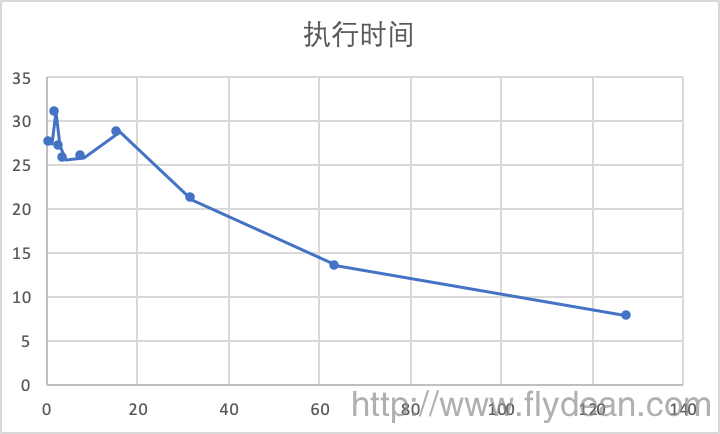 从图表可以看出,步长在1到16之间的时候,执行速度都还相对比较平稳,在25左右,然后就随着步长的增长而下降。