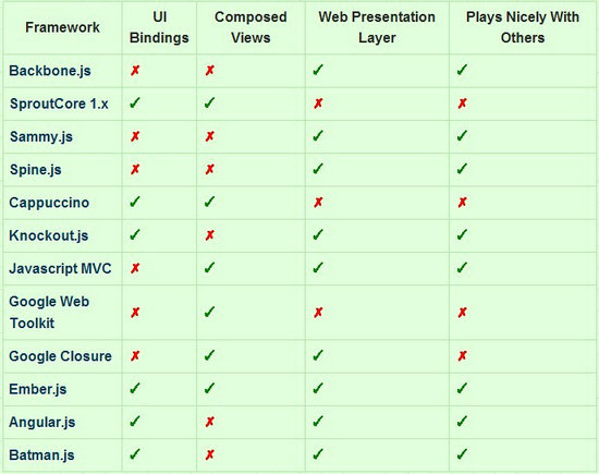下面是2012年外国对当时流行12个JavasScript MVC框架的纯技术评估: