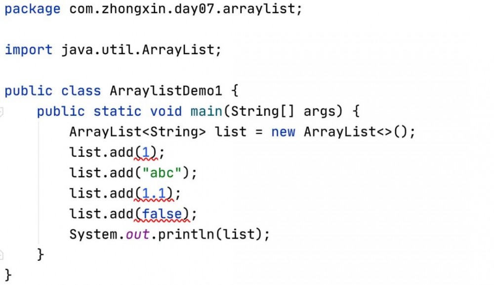 System.out.println(list); // [1, abc, 1.1, false]