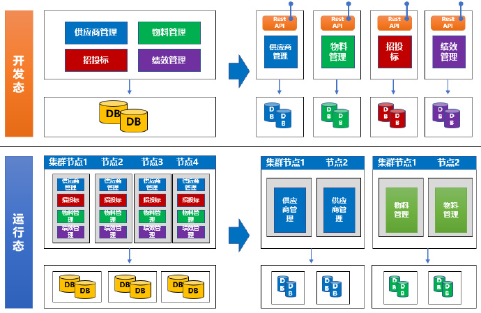 我们要构建的SRM系统就是典型的单体应用,那么我们来看这个单体应用构建模式转变到微服务构建模式后究竟带来了哪些变化。如下图,我们从开发态和运行态去分析。