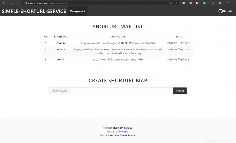 webroot/management.html 基于 Vue 和 Bulma 构建的前端管理界面,用来查看已创建的 shorturl 和 创建新 shorturl。