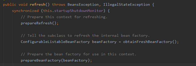第三步,prepareBeanFactory(beanFactory) ,做进一步的 BeanFactory 的准备工作,主要是为其增加 BeanClassLoader、BeanExpressionResolver、PropertyEditorRegistrar、BeanPostProcessor(BeanPostProcessor,ApplicationListenerDetector)等操作,之所以有这一步是因为后续的 Bean 的实例化以后 DI 的相关操作等会依赖这些类提供的操作;可以理解是为其设置了一系列的 静态代理 ,在 Bean 的实例化的过程中某些操作就需要通过这些代理去完成