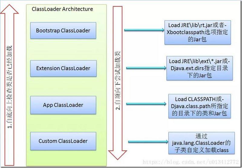 如果一个类加载器收到了加载某个类的请求,则该类加载器并不会去加载该类,而是把这个请求委派给父类加载器,每一个层次的类加载器都是如此,因此所有的类加载请求最终都会传送到顶端的启动类加载器;只有当父类加载器在其搜索范围内无法找到所需的类,并将该结果反馈给子类加载器,子类加载器会尝试去自己加载。