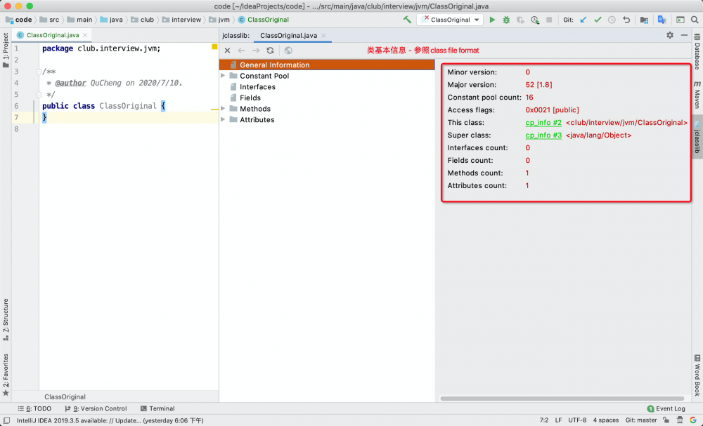菜瓜:是的,在研究第四章-The class File Format. 讲的是class文件结构。以前模糊的知道我们写的java代码是以二进制字节码加载到虚拟机然后执行的,但是没有见识过
