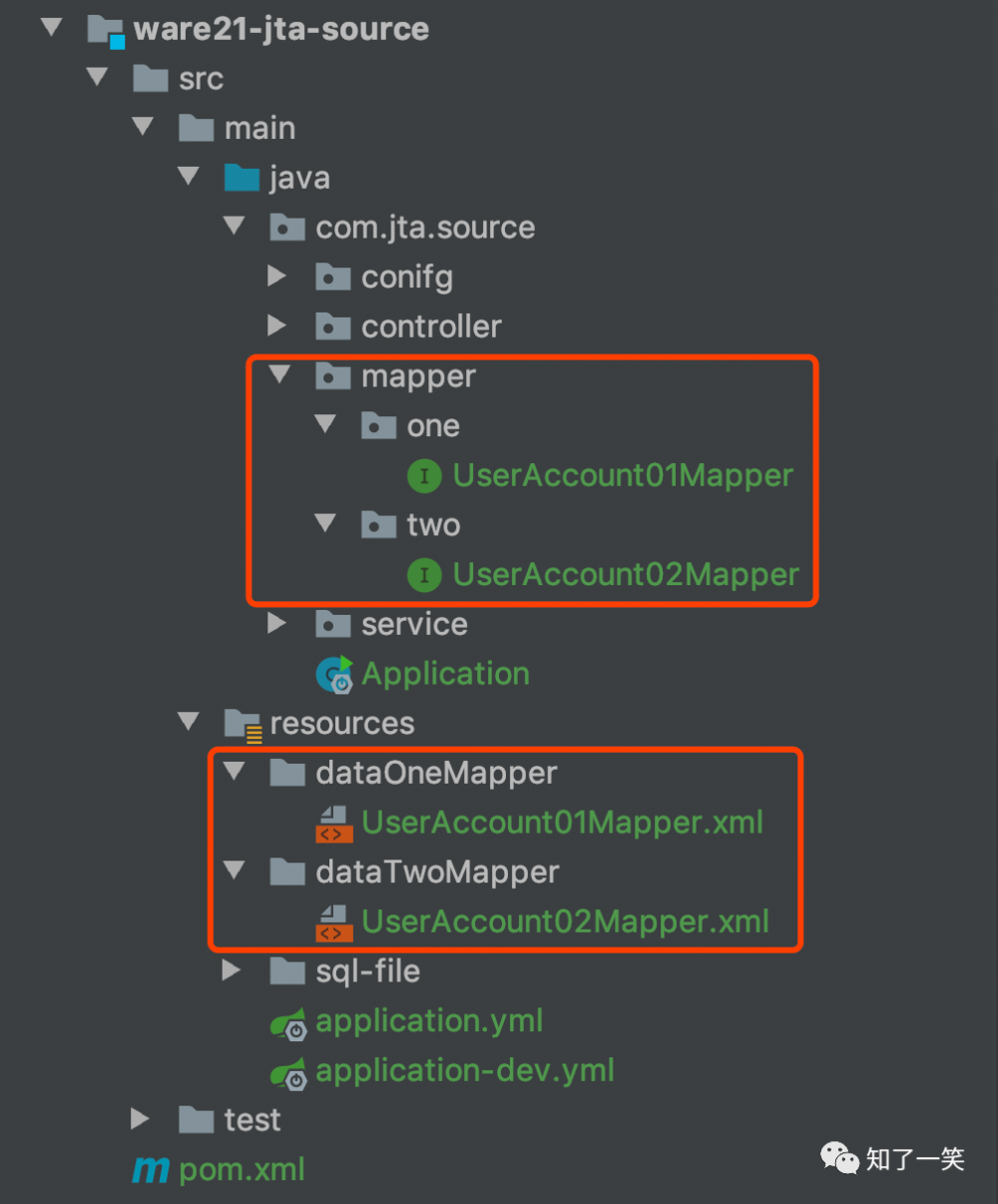 这里两个数据库连接的配置手法都是一样的,可以在源码中自行下载阅读。基本思路都是把数据源交给JTA组件来统一管理,方便事务的通信。