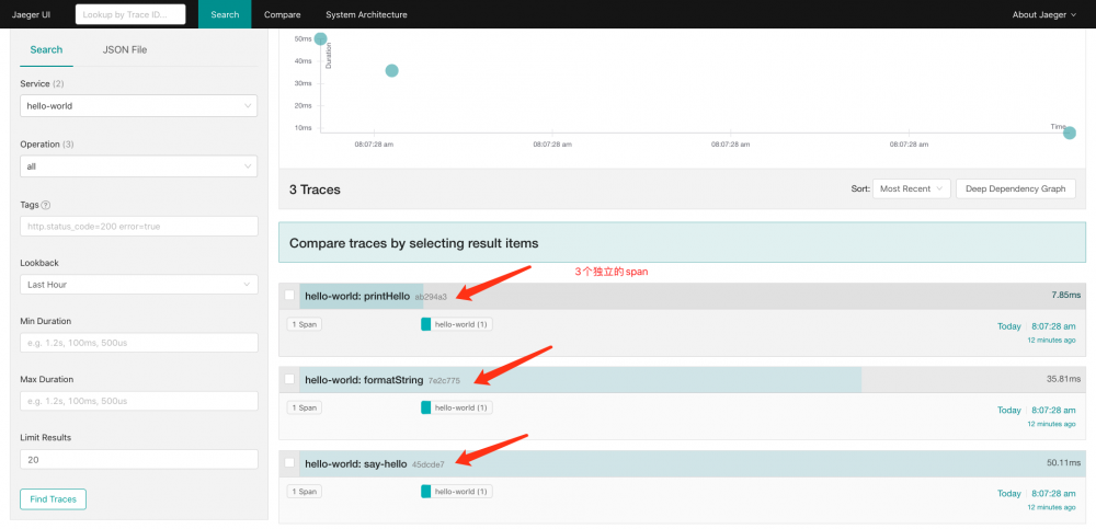 可以看到只新产生了一个trace,且里面包含了3个span。点开这个trace: