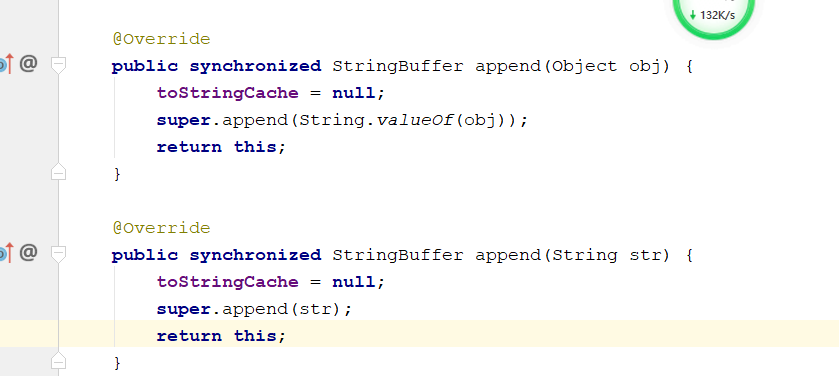 首先我们要清除StringBuffer是线程安全的,因为它在每一个方法上都加了synchronized锁,下图是StringBuffer的源码