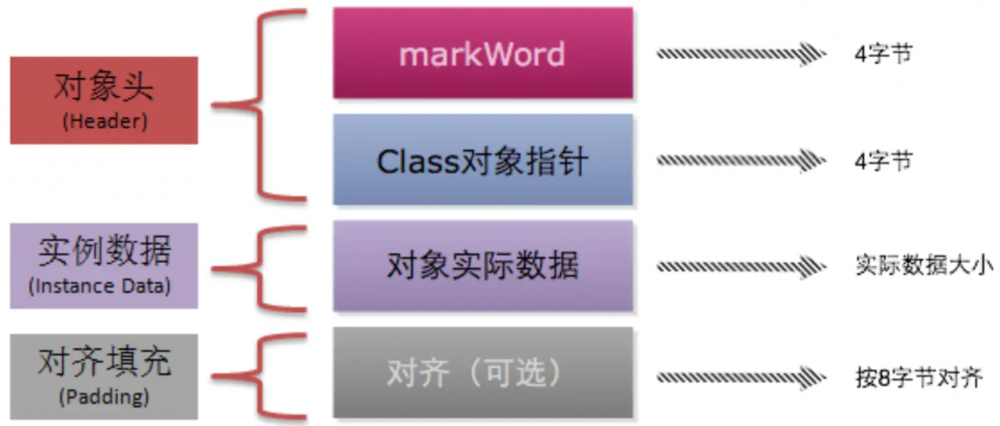 一个对象其实分成三部分,对象头,类型指针和实例数据。其中,对象头主要用于GC,锁,线程控制等。类型指针用于获取这个类的Class 信息。最后的初始化的数据就是放在示例数据中的。