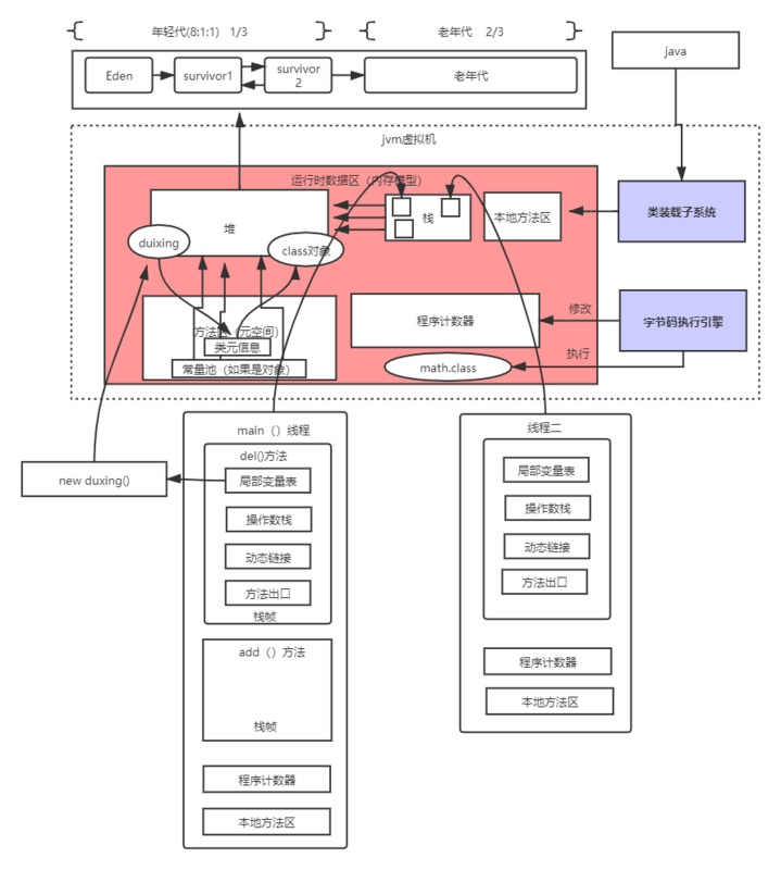 通过类装载子系统进行装载类,然后通过字节码执行引擎进行执行,执行main()方法时,在栈中划分一小部分空间生成线程栈,在线程栈中为main方法生成独立栈帧,如果类中有其他方法,则生成一个新的栈帧,在栈帧中的局部变量表中存放执行过程中的局部变量,在操作数栈中进行对操作数进栈以及出栈,然后在外部执行运算,在赋值给本地变量,其中执行步骤都是由该线程独有的程序计数器计数执行位置供字节码执行引擎执行。如果栈帧中局部变量为对象类型,则局部变量表中存放的是堆中对象的指针地址。该对象头中存在指针,指向其所属的类,也就是指向方法区中该类的地址。当一个类加载到jvm中会产生类对象,即在堆中存放的class对象,方法区中的类元信息会再次指向堆中的class类对象。