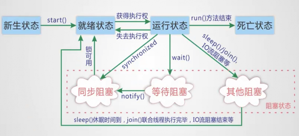 3.进入阻塞状态的四种原因:sleep,wait,join,io等操作