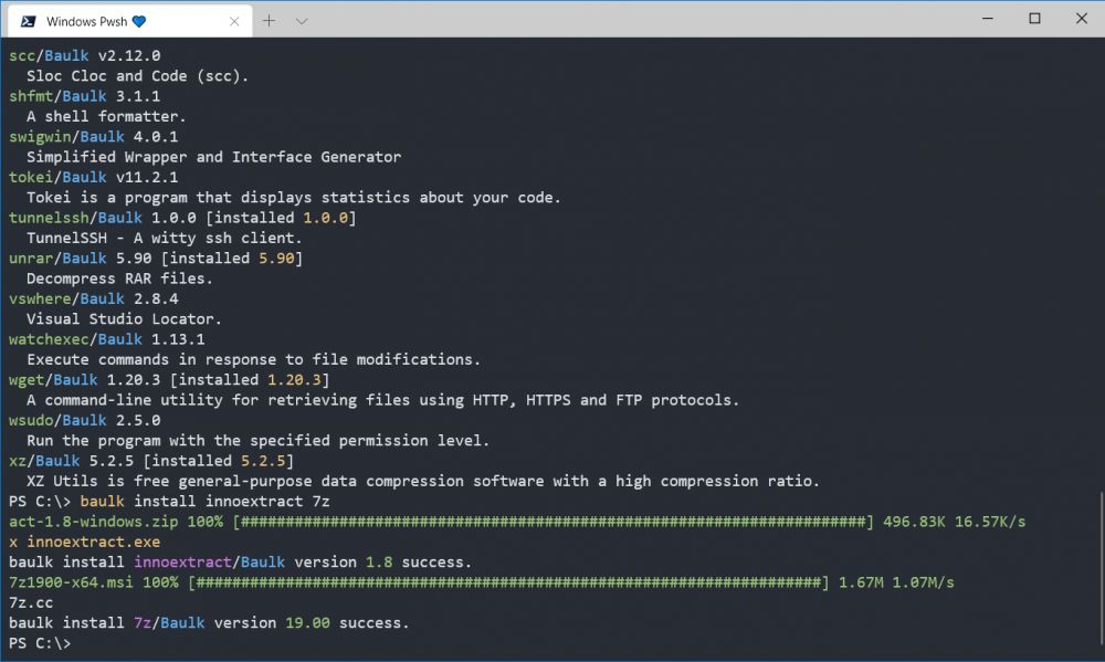 在开发 baulk 时,我就决定只支持 Windows 10 1903 或更新的版本,好处显而易见,可以使用 Windows Terminal,利用 ANSI 转义输出颜色,体验非常不错: