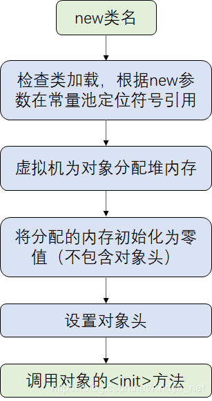 new指令 时,首先检查这个指令的参数是否能在常量池中定位到一个类的 符号引用 ,且检查该符号引用代表的 类是否已被加载、解析和初始化过 。若没有,需先进行相应的类加载过程。 分配内存 。(对象在内存中所需要的大小在类加载完成后就确定了) 初始化为零值 (不包括对象头)。保证了对象的实例字段在Java代码中可以不赋初始值就直接使用,可以访问对应的零值。(对应准备阶段) 对象头的设置 )。如这个对象是哪个类的实例、如何找到类的元数据信息、对象哈希码、对象的GC分代年龄等信息。 <init> 方法,将对象在程序中进行初始化。 为对象分配空间就是从 Java堆 中划分出一块确定大小的内存给新生对象,考虑符合划分可用空间的两种方式: “指针碰撞”和“空闲列表”